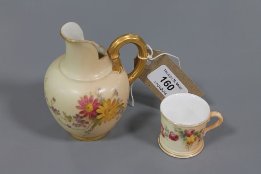 A Royal Worcester blush ivory gilded jug, height 10.7cm, together with a Royal Worcester Blush Ivory miniature tankard height 4cm