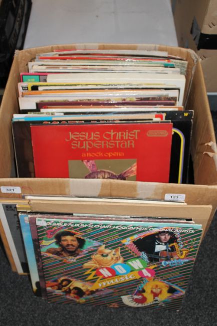 A box containing LP's including NOW albums, easy listening, Lindisfarne, Eagles, etc