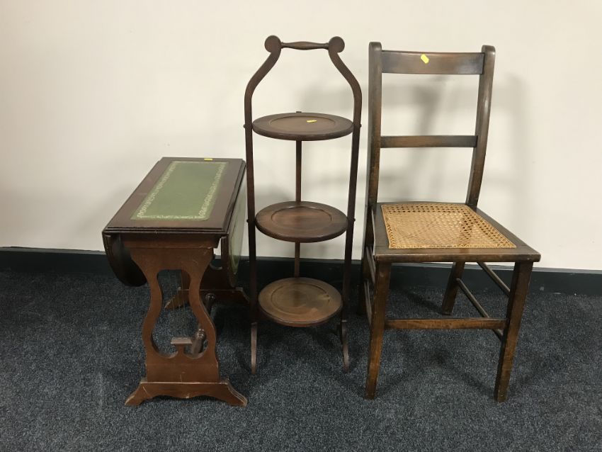 An oak bergere seated bedroom chair, together with a mahogany three tier folding cake stand and a mahogany leather topped flap sided table