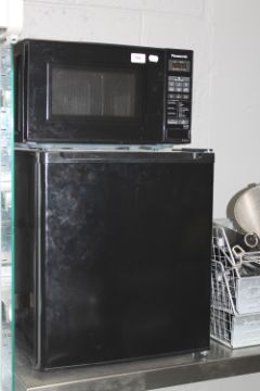 A Panasonic microwave , together with a bench top fridge (black)