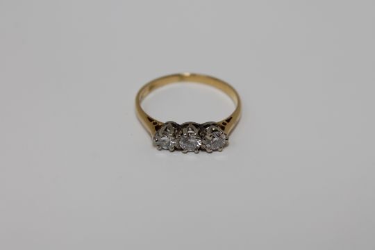 An 18ct gold three stone diamond ring, approximately 0.5ct, size O/P, 2.7g.