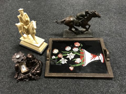 An early 20th century carved wooden tray, a standard lamp and shade, Chinese figure Emperor on horse back, horse and jockey and a Buddha figure