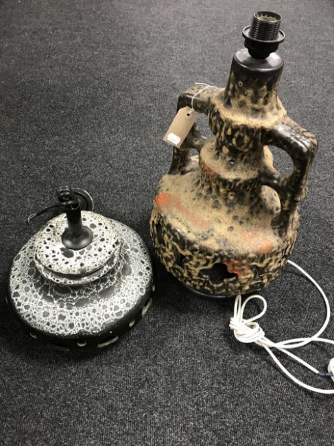 A vintage 1970's rise and fall light fitting, in fat lava style together with a Slien Keramik fat lava West German pottery lamp
