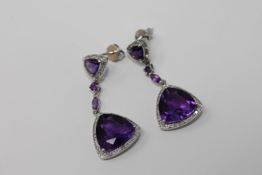 A pair of 9ct white gold amethyst earrings set with diamonds.