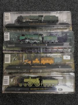 Four model trains on stands including Stephenson's Rocket
