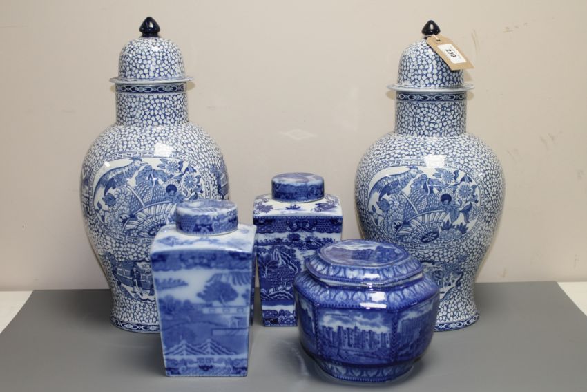 A pair of Adams blue and white lidded vases in an oriental style, together with two Ringtons Willow Pattern tea caddies and a Ringtons castles tea caddy