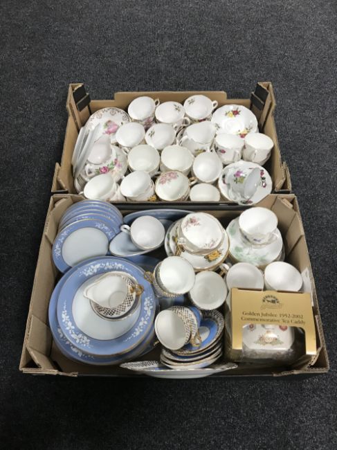 Two boxes containing assorted tea china and dinnerware, together with a boxed Ringtons golden jubilee commemorative tea caddy