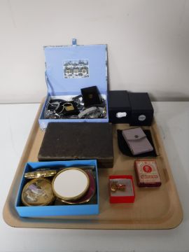 A tray containing two boxed gents Sekonda wrist watches, lighters, pen knives, ladies compacts, cased manicure set, etc