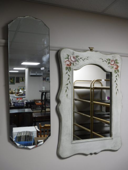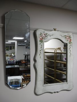 A floral painted framed mirror and an un-framed hall mirror