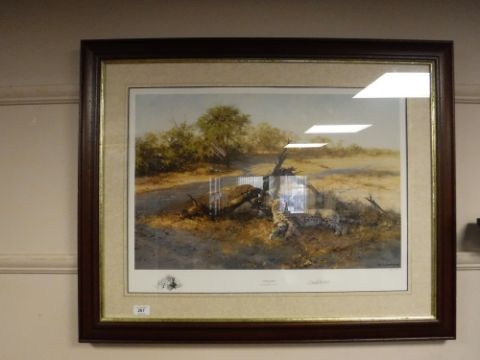 After David Shepherd : Savuti Sands, reproduction in colours, numbered 548/1000, signed in pencil, with monochrome remarque, 40 cm x 61 cm, framed.