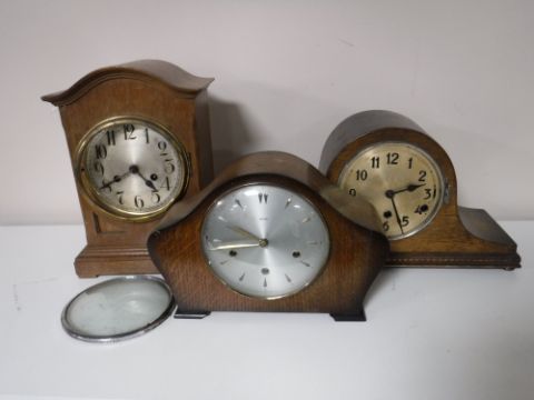 A late Victorian mantel clock, together with two other oak mantel clocks