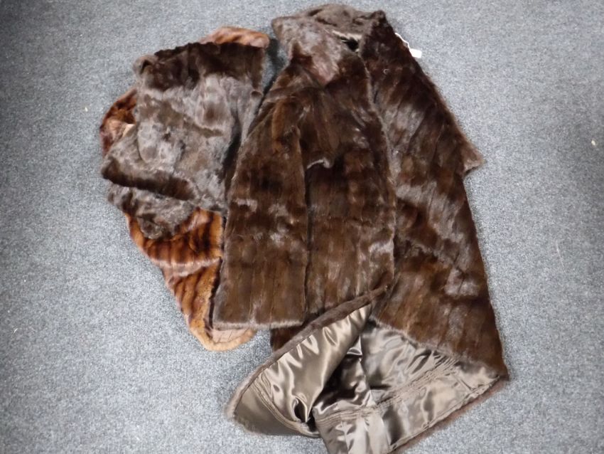 Good vintage dark brown glossy fur coat with collar. Unbranded. Size approximately 14 length 120 cms, width across back 56cms together with two shoulder stoles, one matching the fur coat and the other dark and medium brown with pockets in good condition. (3) CONDITION REPORT: Coat -Generally good condition but requires repair to under arm and lining on one side.Matching stole - requires repair to lining.