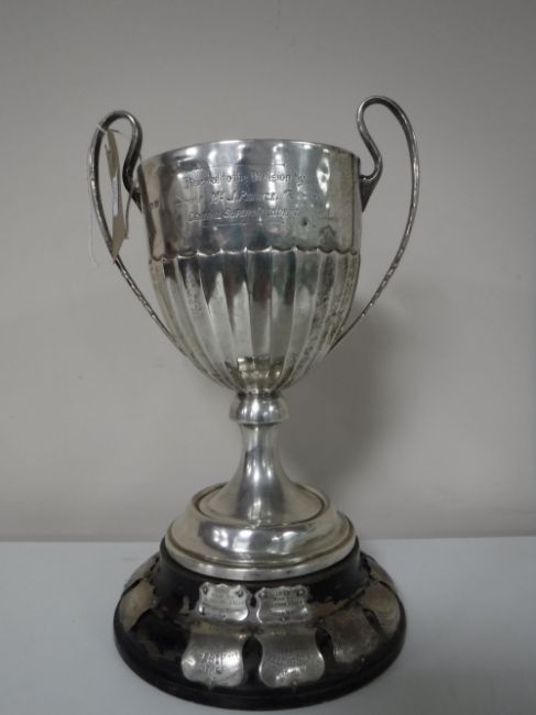 A sterling silver twin handled trophy, 'Pearl Life Assurance Co Challenge Cup', 441g, on turned ebonised base, height 20cm