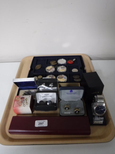 A collection cufflinks including Wedgwood, Magic Roundabout, Swarovksi, boxed gent's Lorus wrist watch, one other watch, coins including five HM Queen Elizabeth II , pennies etc