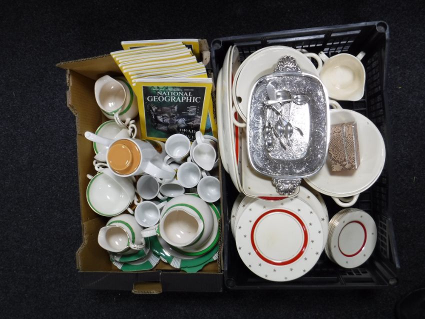 Two boxes containing Woods Stardust dinnerware, Queens Green china, a Meakin coffee service, plated ware and National Geographic magazines