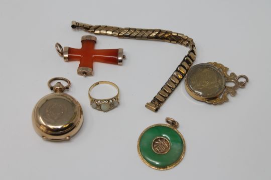 A Victorian gold plated sovereign case together with a three stone opal ring set with rose cut diamonds, a yellow metal mounted agate crucifix, an expansion bracelet, a 9ct gold mounted enamel fob and a Chinese jade gold mounted pendant. (6)