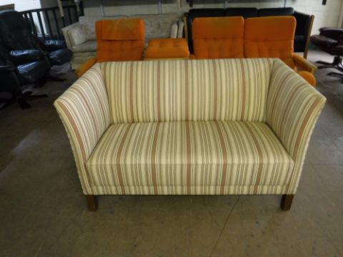 Approximately 72cm high, 120cm wide and 74cm deep. Scuffs to feet. Fabric perhaps a little tired but with no real issues.