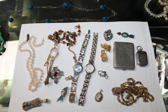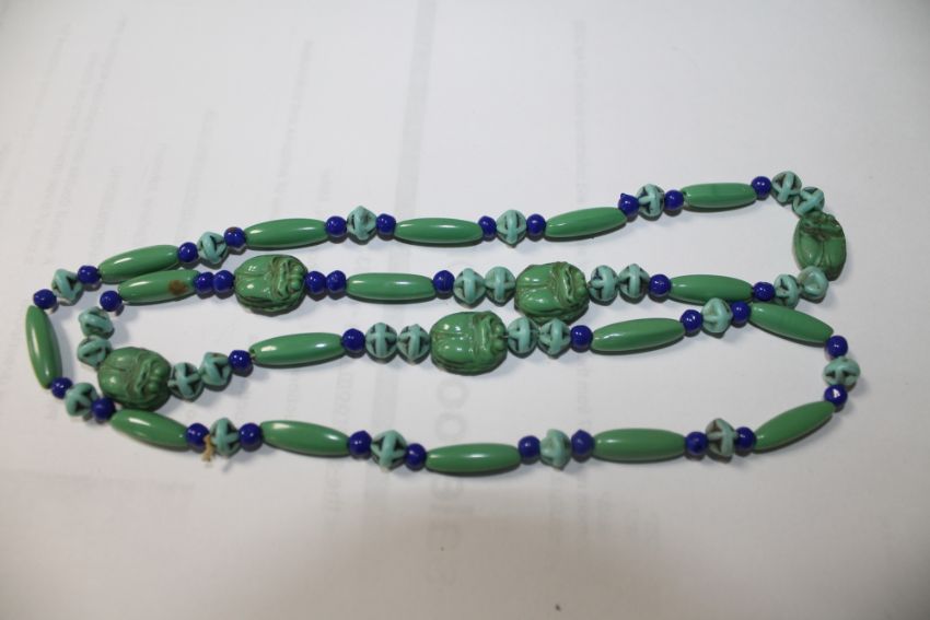 The scarab necklace looks to be a fairly modern tourist piece made from coloured stones.