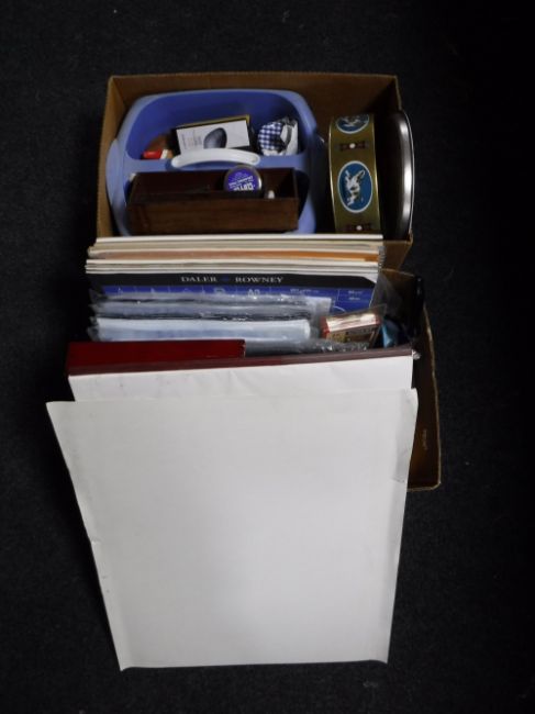 Two boxes of artist's paper, brushes, crafting tools, computer software, boxed art light box