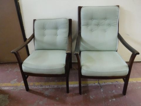 A pair of stained beech framed armchairs upholstered in green button fabric