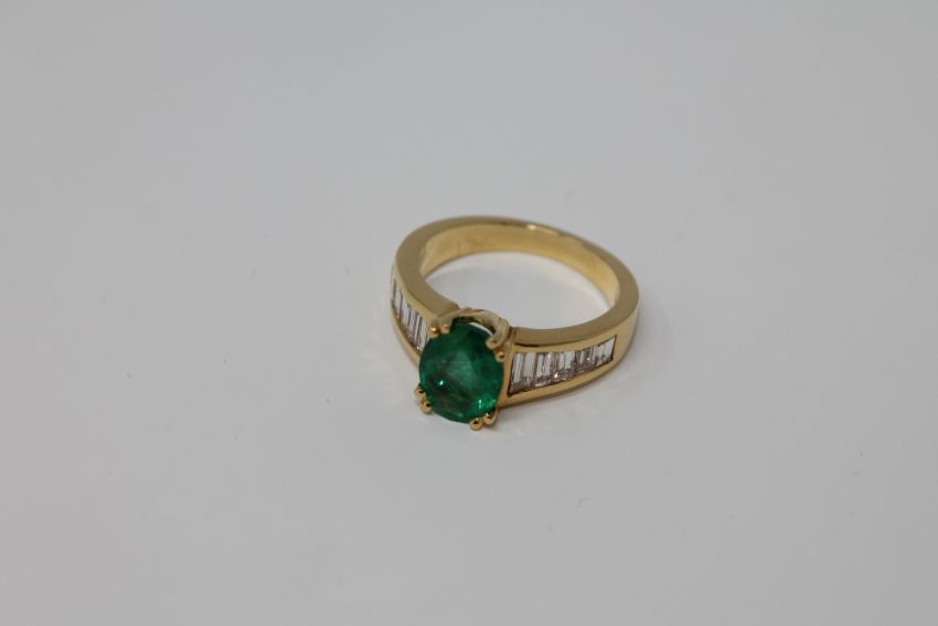 The ring is in good condition. It is 6.5g. The emerald is ever so slightly loose in its claw setting and needs to be tightened slightly. The emerald has not been professionally tested for origin. The particularly vibrant green colour suggests a synthetic origin. It measures 9.17mm by 6.97mm. The diamonds are in good condition. The total diamond weight is estimated at 0.7 carat. Approximate colour - I/J. Clarity - VS1/VS2.