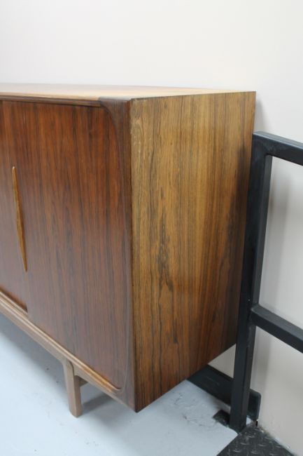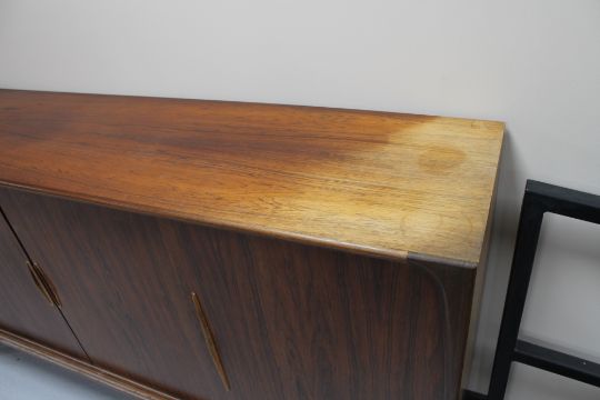 Section of top sun-faded, see images. Front left foot with damage to veneer. Otherwise in good condition. 98cm high by 210cm wide by 42cm deep.