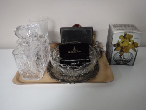 A tray containing a boxed Dartington glass vase, glass duck ornaments, decanters, drawing instruments, French mother of pearl opera glasses etc