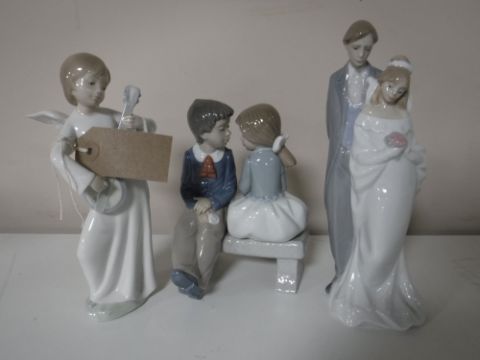 Three Nao figures; boy and girl on bench, angel, bride and groom