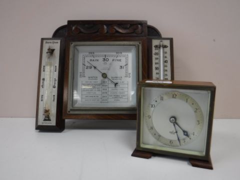 A carved oak barometer by Walker of Sunderland, together with a cased Elliot mantel clock