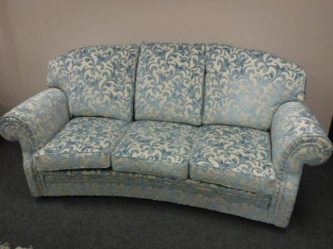 A high quality Bridgewood three seater curved seater settee upholstered in a two tone fabric, together with matching armchair (2)