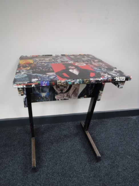 A school desk, decorated with pictures of rock stars