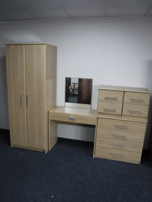 A contemporary five piece bedroom suite : wardrobe, dressing table, pair of bedside chests and four drawer chest