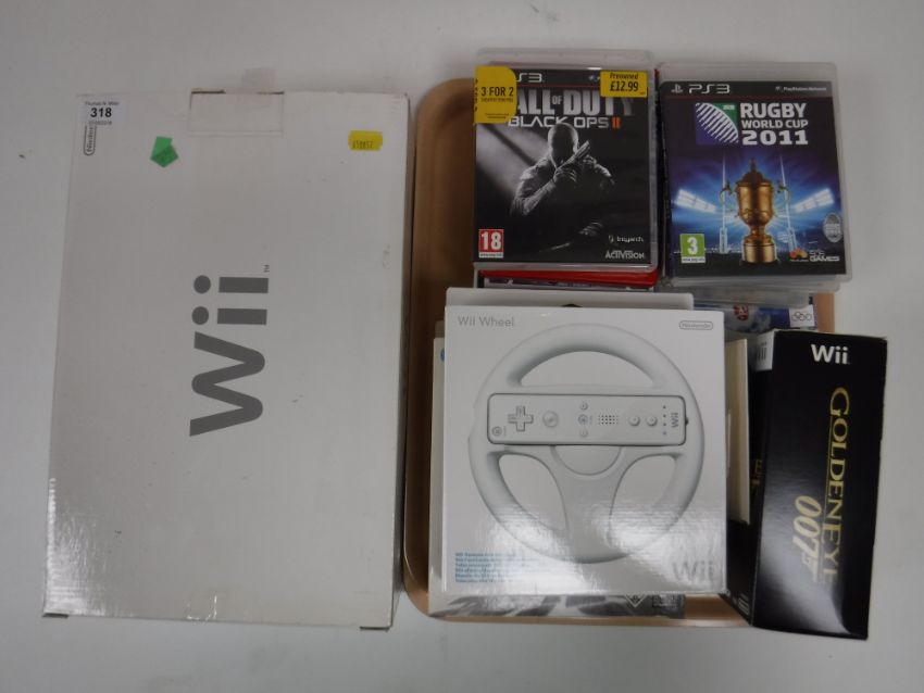 A boxed Nintendo Wii, together with a tray of assorted Nintendo Wii games, accessories, together with PS3 games