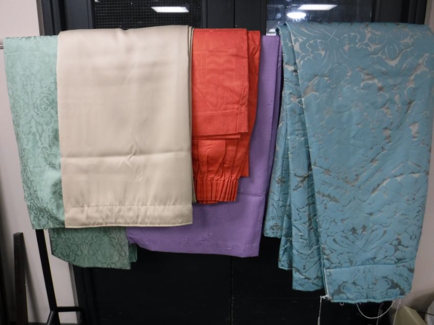 A pair of silver and turquoise lined curtains and four further pairs of various colours