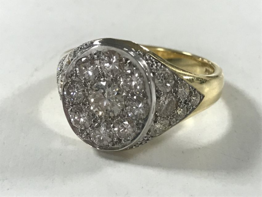 A superb quality 18ct gold diamond set signet ring, the centre stone weighing approximately 0.6 carat, surrounded by an additional 14 diamonds weighing 0.2 carat each and a further 6 diamonds weighing 0.05 carat each, the total diamond weight estimated at 3.6 carats, weight 13.6 grams