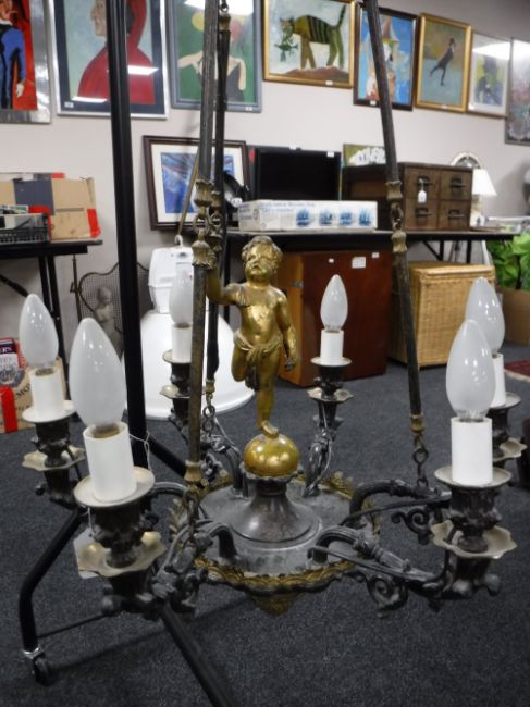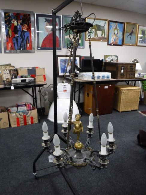 A continental metal six branch chandelier surmounted with a cherub