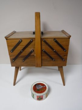 A concertina sewing box and contents