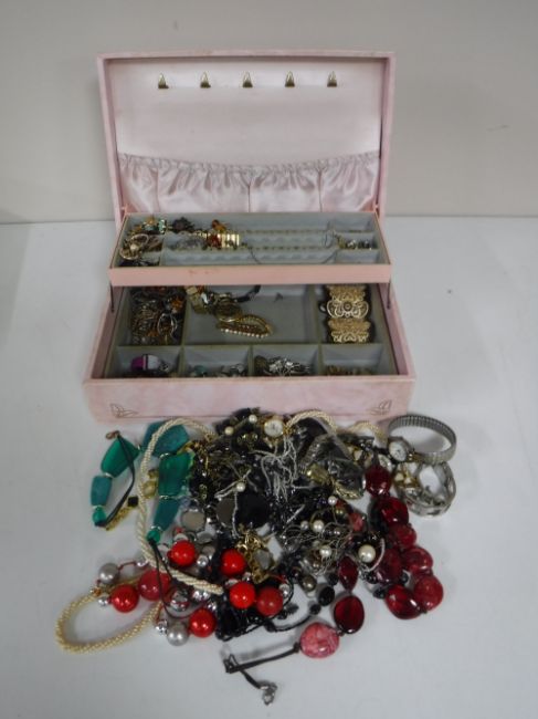 A jewellery box containing a quantity of costume jewellery together with a 9ct gold ring and a silver ring etc