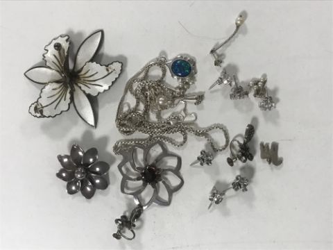A collection of silver jewellery including a Norwegian enamel flower brooch