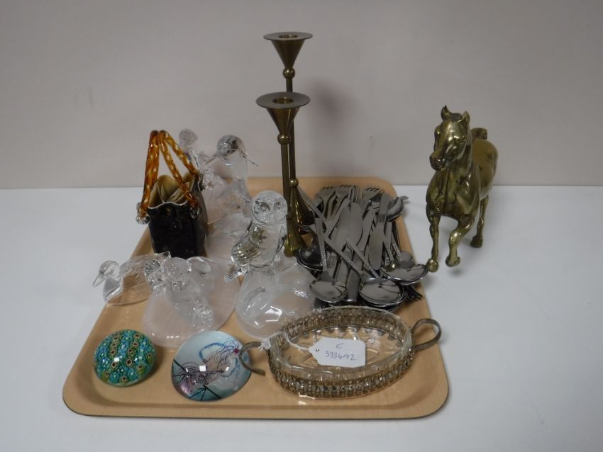 A tray containing a quantity of frosted glass animal ornaments, loose cutlery, brass model of a horse, paperweights, etc