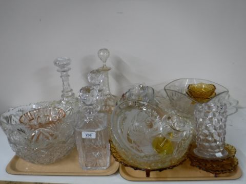 Two trays containing four decanters with stoppers, pressed glass fruit bowls, amber glass ware etc