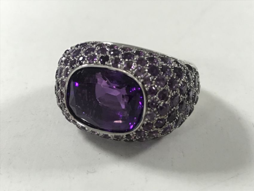 An 18ct white gold and amethyst cluster ring, 16.5g, size N