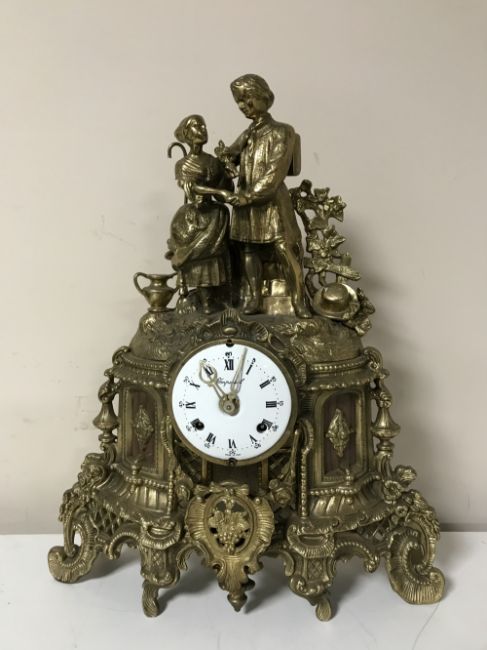 An ornate brass Imperial mantel clock, with figural decoration and enamelled dial
