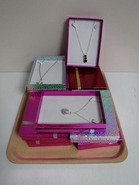 A tray containing eleven boxed costume necklaces