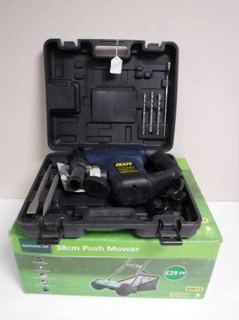 A boxed Powercraft hammer drill and a Gardenline push mower