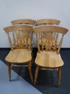 A circular pine pedestal dining table together with four pine fiddle back chairs