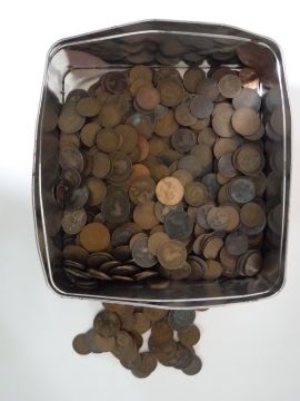 A tin containing a quantity of Georgian pennies and assorted coinage