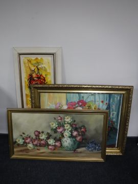 Two gilt framed continental school oils on canvas, still life's, together with a framed abstract relief panel