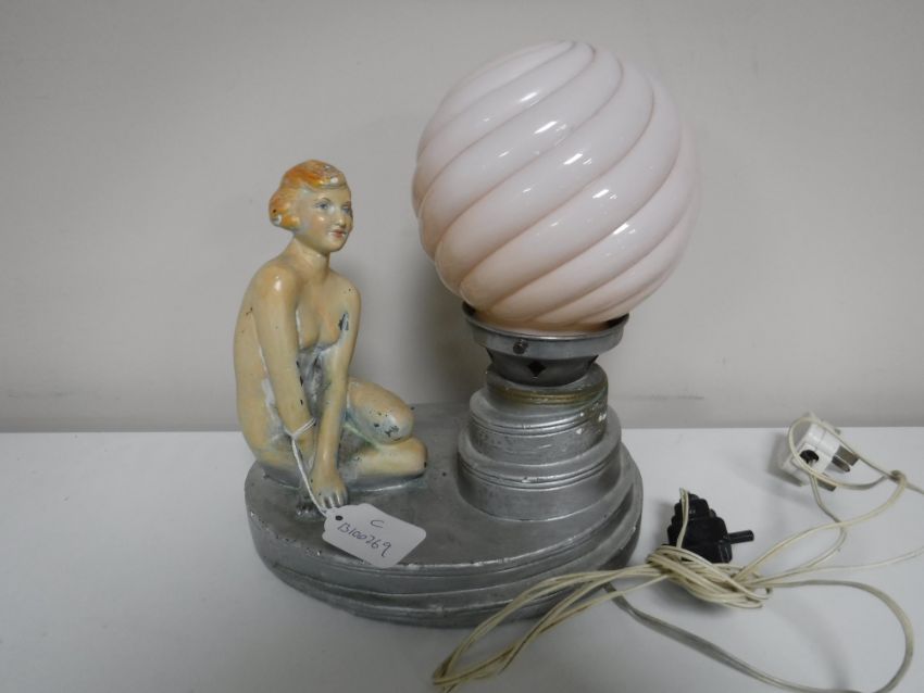 A chalk Art Deco table lamp with a pink glass shade