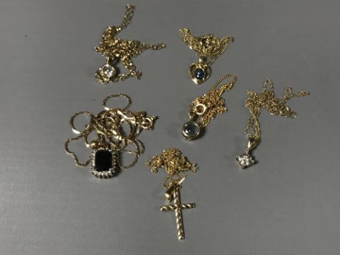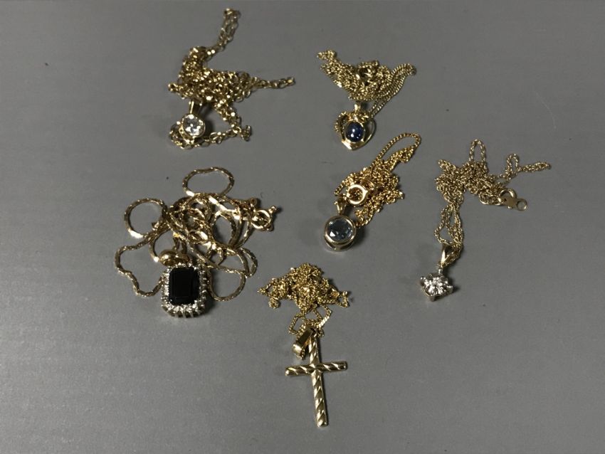 Six 9ct gold necklaces and pendants - one set with blue sapphire and diamonds. (6)